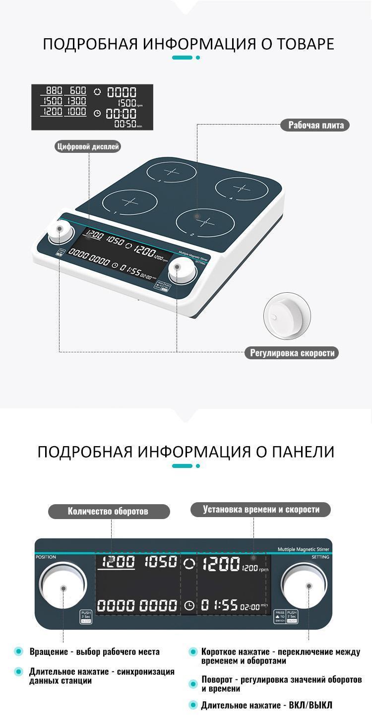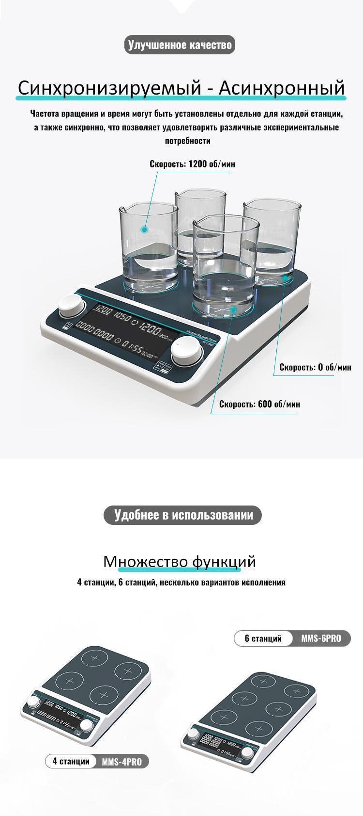 Повышение эффективности: Многоместные мешалки позволяют одновременно перемешивать несколько растворов, что значительно сокращает время, необходимое для подготовки проб.
