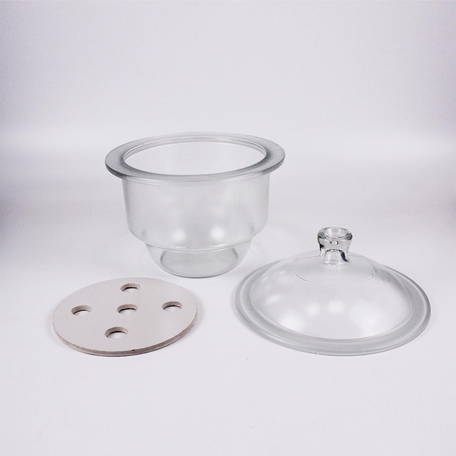 Благодаря специальным фарфоровым вкладышам внутрь посуды можно поставить тигель кварцевый, выпарные чашки, чашки Петри, бюксы и другие емкости. На дно эксикатора может быть помещен силикагель или другое гигроскопичное вещество для осушения, которое не входит в комплект поставки.