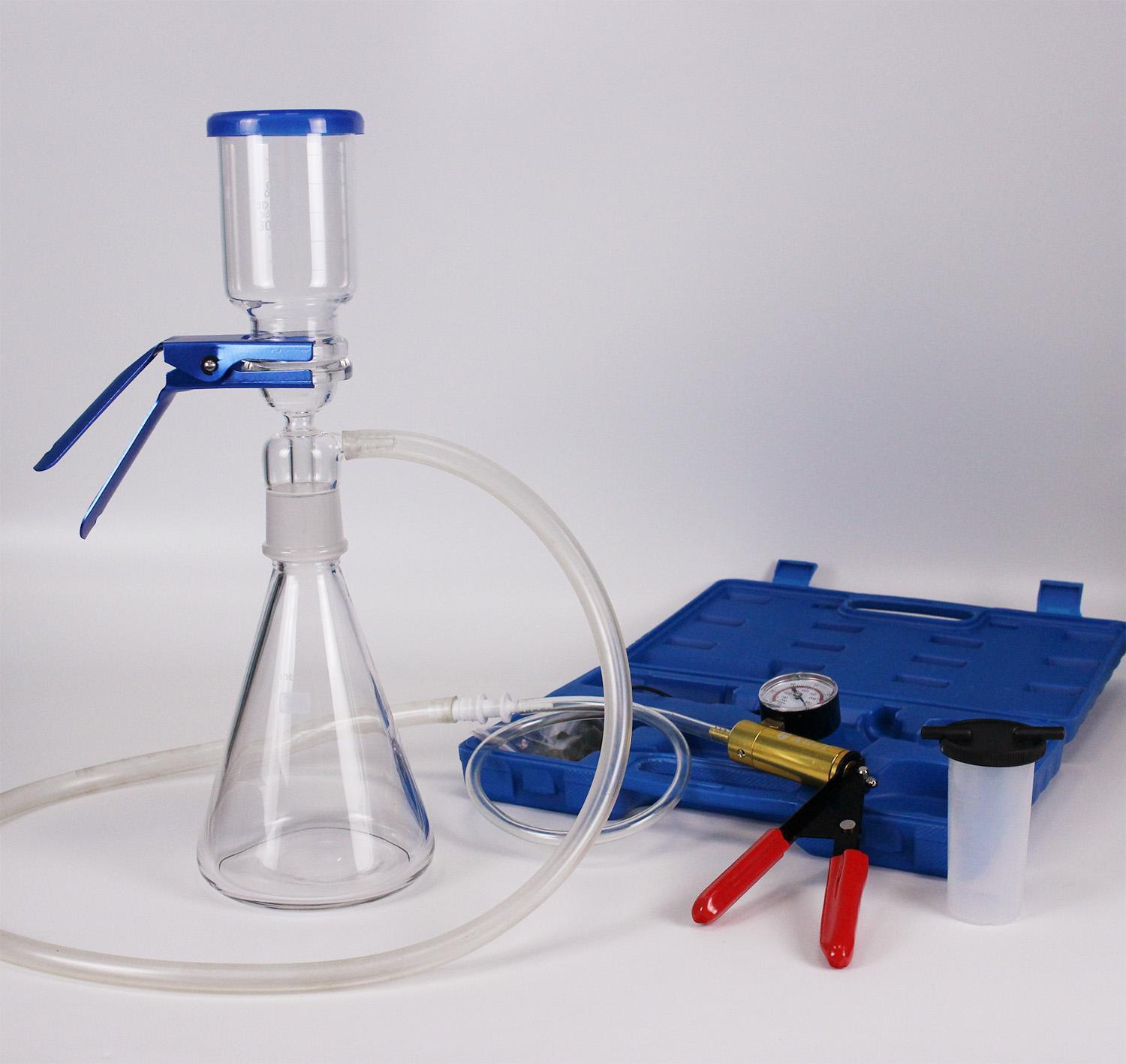 Система вакуумной фильтрации Labdevices - "MicroFiltr" на 2000 мл + ручной насос, 0 - 30 PSI - современная удобная лабораторная установка, позволяющая проводить вакуумную фильтрацию различных химических жидкостей. Вакуумная фильтрация применяется при проведении химического и биологического анализов с целью сокращения времени. Она используется для получения как осадка, так и чистого фильтрата. Позволяет полнее отделять жидкость от твердых включений, полученный осадок легче промывается от остатков жидкости. Классическая устновка для фильтрования под вакуумом собирается из фарфоровой воронки Бюхнера и колбы Бунзена при обязательном использовании бумажных обеззоленных фильтров.
