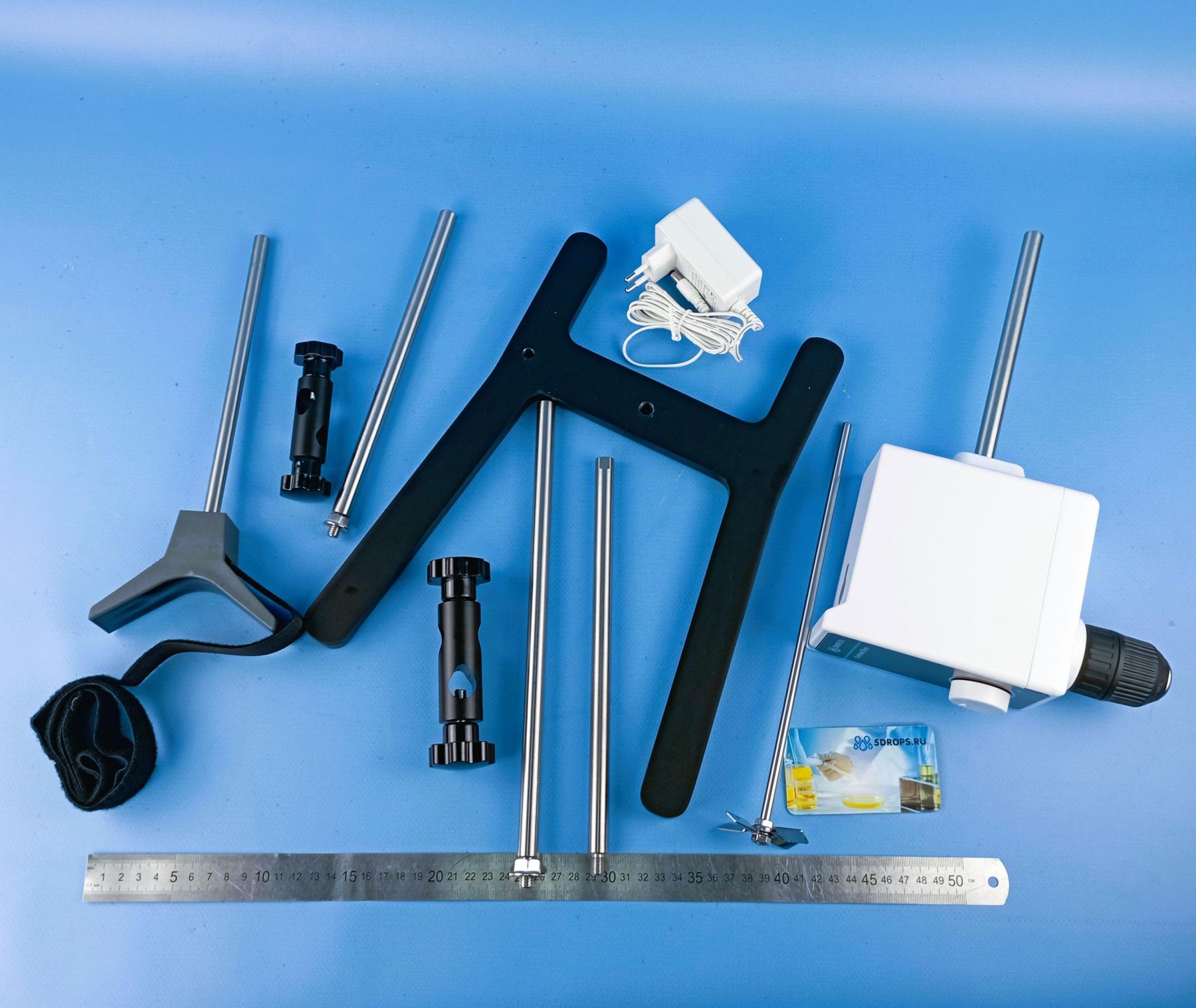 Модель мешалки Labdevices-OS-10 по умолчанию не комплектуется дополнительным мини штативом для удержания лабораторной посуды, полностью собранная верхнеприводная мешалка со всеми входящими позициями в комплект представлена на реальных фото.