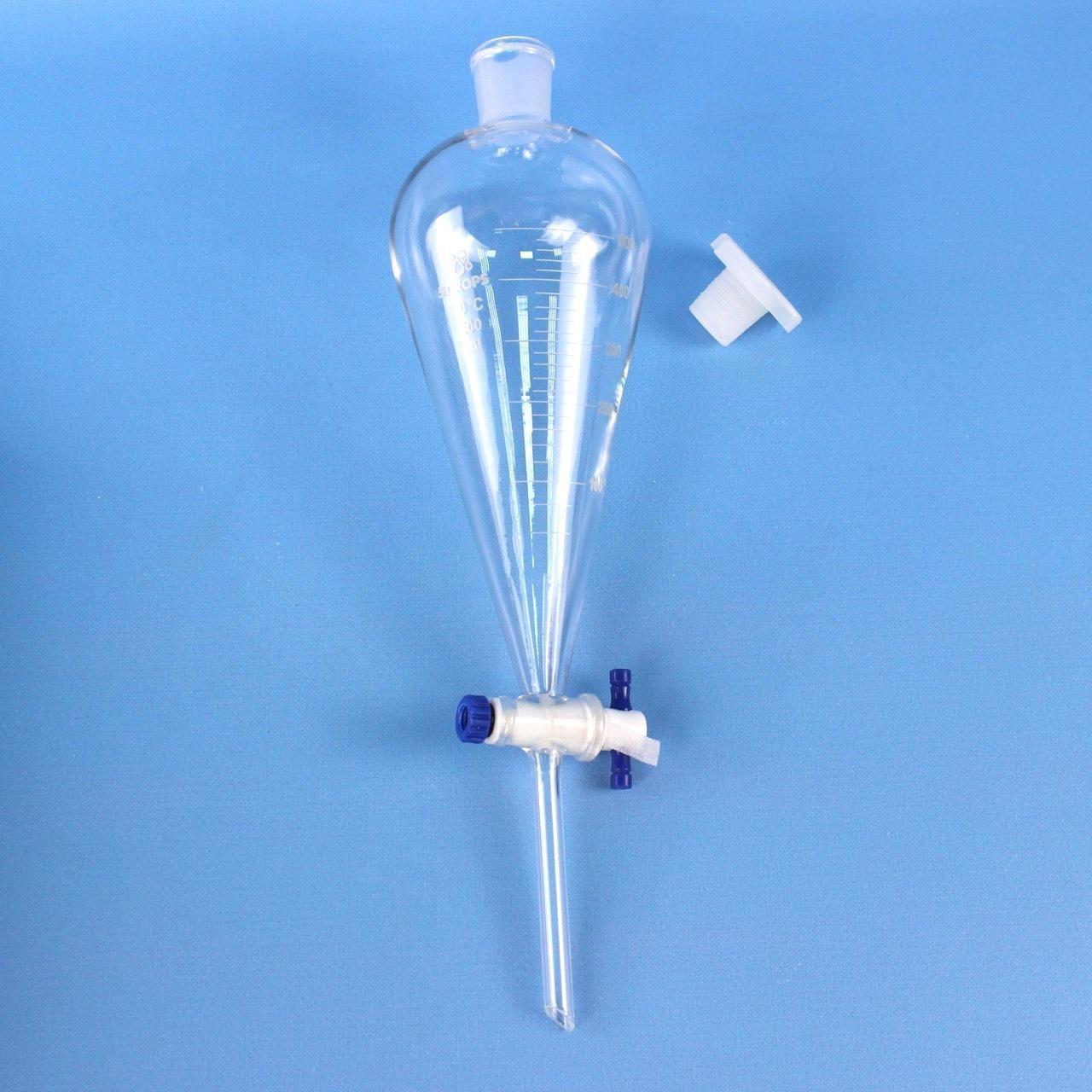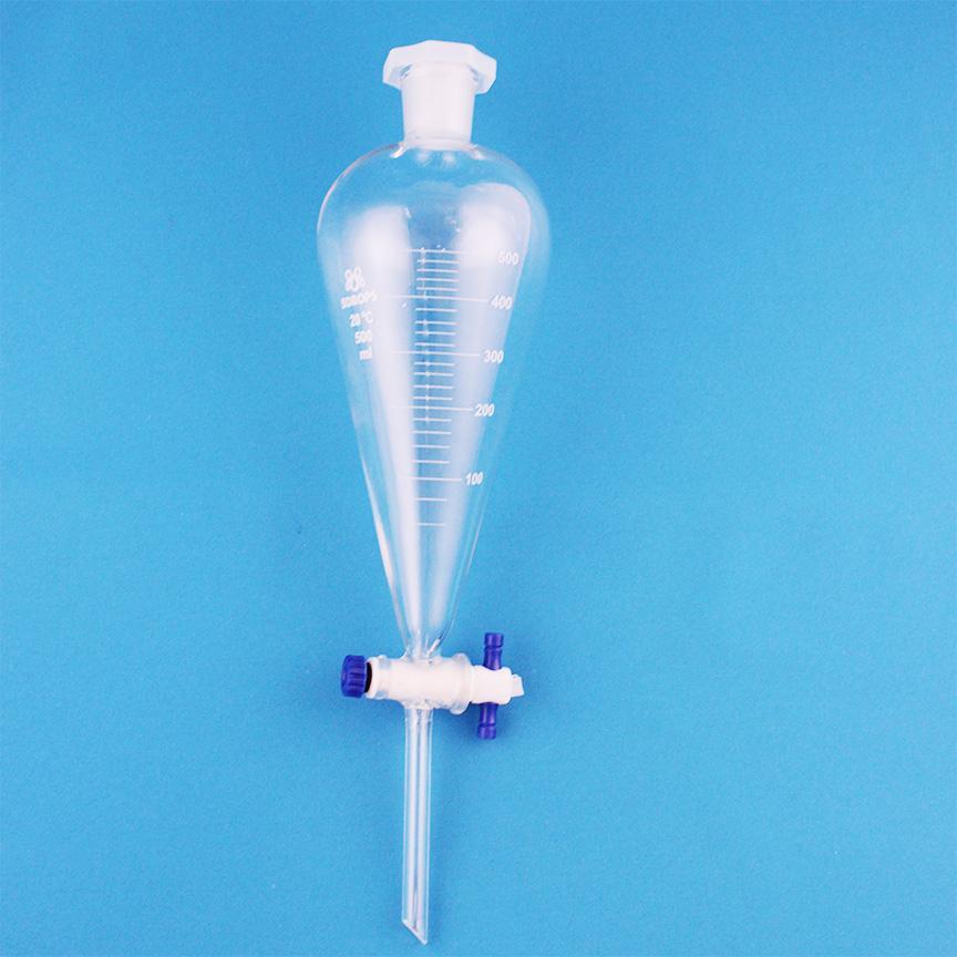 Воронка делительная грушевидная Labdevices ВД-3-500, 500 мл, с делениями, с фторопластовым краном - незаменимый прибор для любой лаборатории, проводящей экстракцию жидкость-жидкость или разделение смесей. Воронка имеет грушевидную форму для улучшения процесса разделения, полиэтиленовую (ПЭ) пробку для надежного уплотнения и запорный кран из ПТФЭ для точного контроля над потоком жидкости.